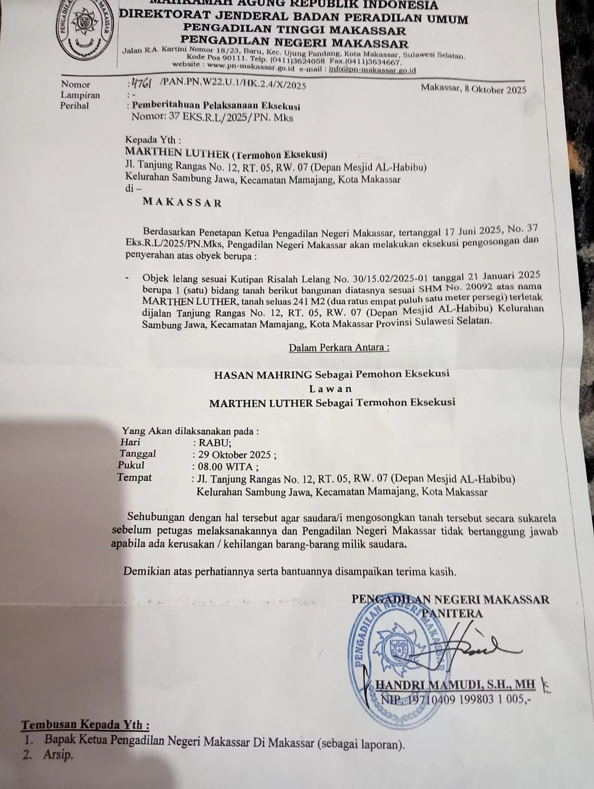 Fatihmedianusantara.com Makassar Sulsel, – Rencana eksekusi rumah milik warga bernama Marthen di Jalan Tanjung Rangas No. 12, RT 05/RW 07, Kelurahan Sambung Jawa, Kecamatan Mamajang, Kota Makassar, resmi ditunda.