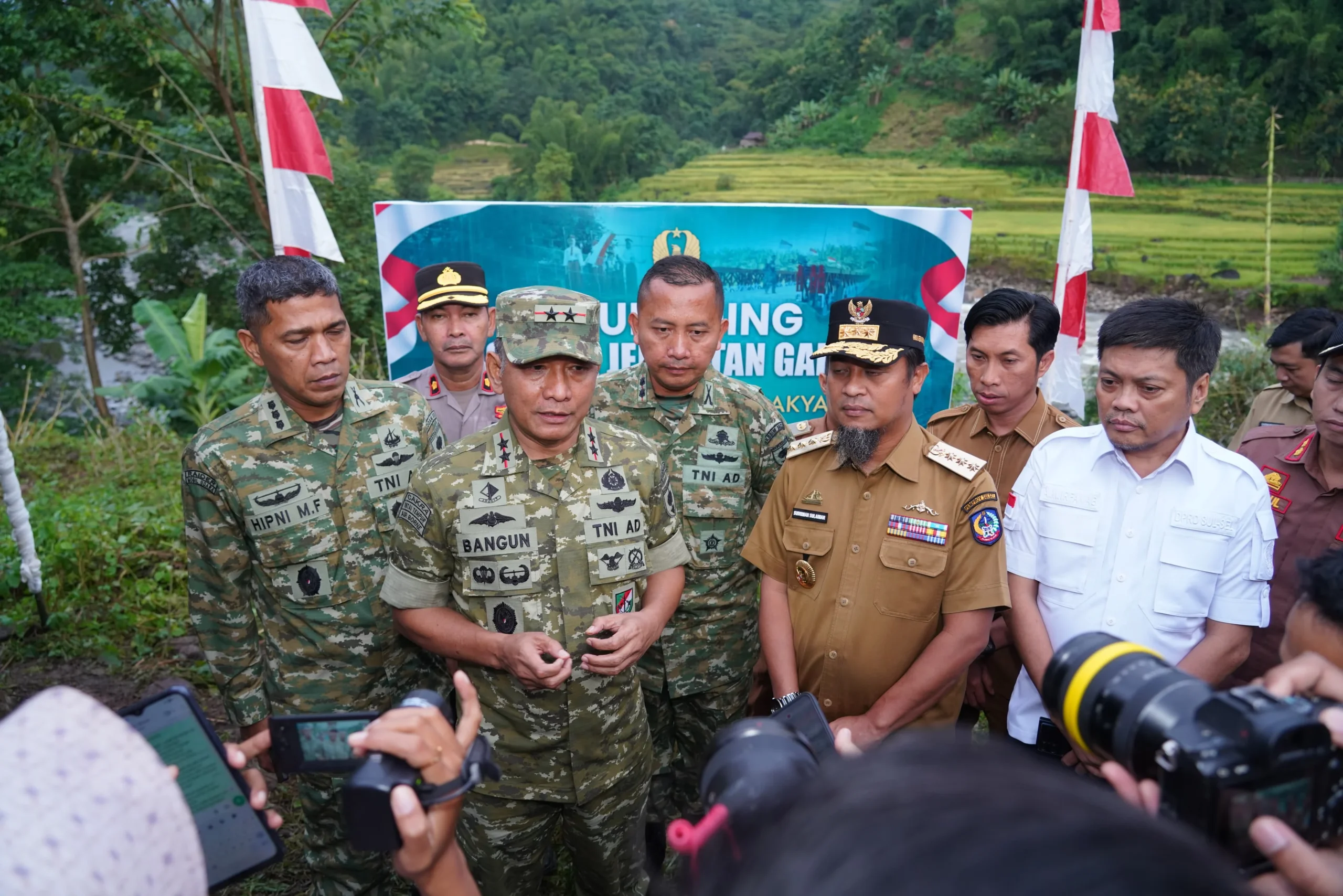Fatihmedianusantara.com Maros Sulsel, – Sebagai wujud dukungan terhadap pembangunan infrastruktur yang bermanfaat bagi kesejahteraan masyarakat, Pangdam XIV/Hasanuddin Mayjen TNI Bangun Nawoko didampingi Ketua Persit KCK PD XIV/Hasanuddin Ny. Renny Bangun Nawoko bersama Gubernur Sulawesi Selatan Andi Sudirman Sulaiman serta para pejabat utama Kodam mengikuti kegiatan Launching 200 Jembatan Garuda secara virtual, bertempat di Desa Bonto Manurung, Kecamatan Tompobulu, Kabupaten Maros. Senin, (9/3/2026).