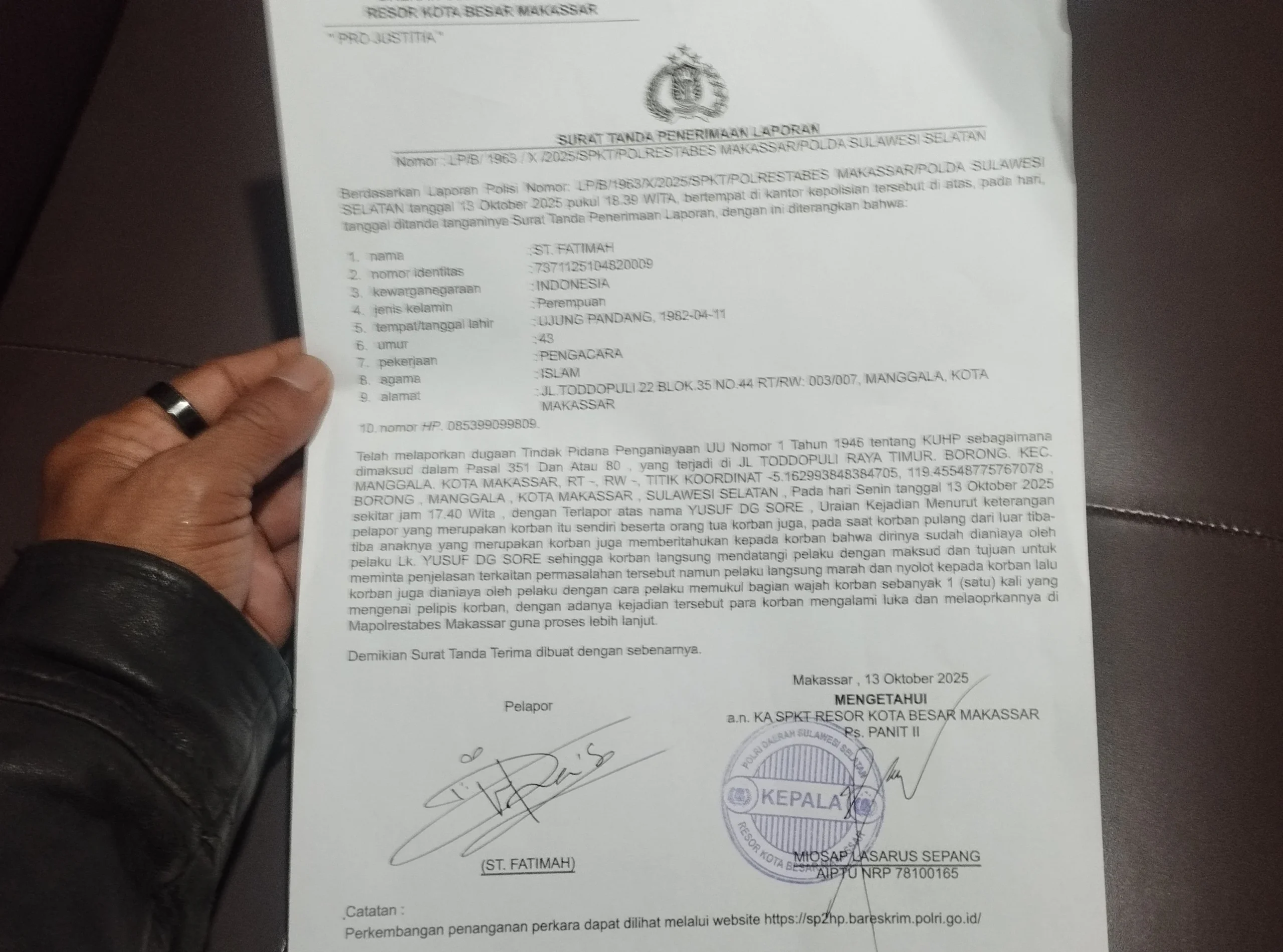 Siti, melaporkan Marbot Masjid, atas nama Yusuf Dg. Sore di Polrestabes Makassar Jalan Ahmad Yani Makassar yang di buktikan Surat Tanda Perimaan Laporan dengan Nomor: LP/B/1963/X/2025/SPKT/Polrestabes Makassar/Polda Sulawesi Selatan, terhadap tindak kekerasan Anaknya Abdul Hadi Yusuf Fazl. yang masih duduk di bangku Taman Kanak-kanak (TK). Pelaku diduga merupakan Marbot (penjaga masjid) di kawasan Jalan Todopuli Raya Timur Makassar. Senin, 13/10/2025 Makassar.