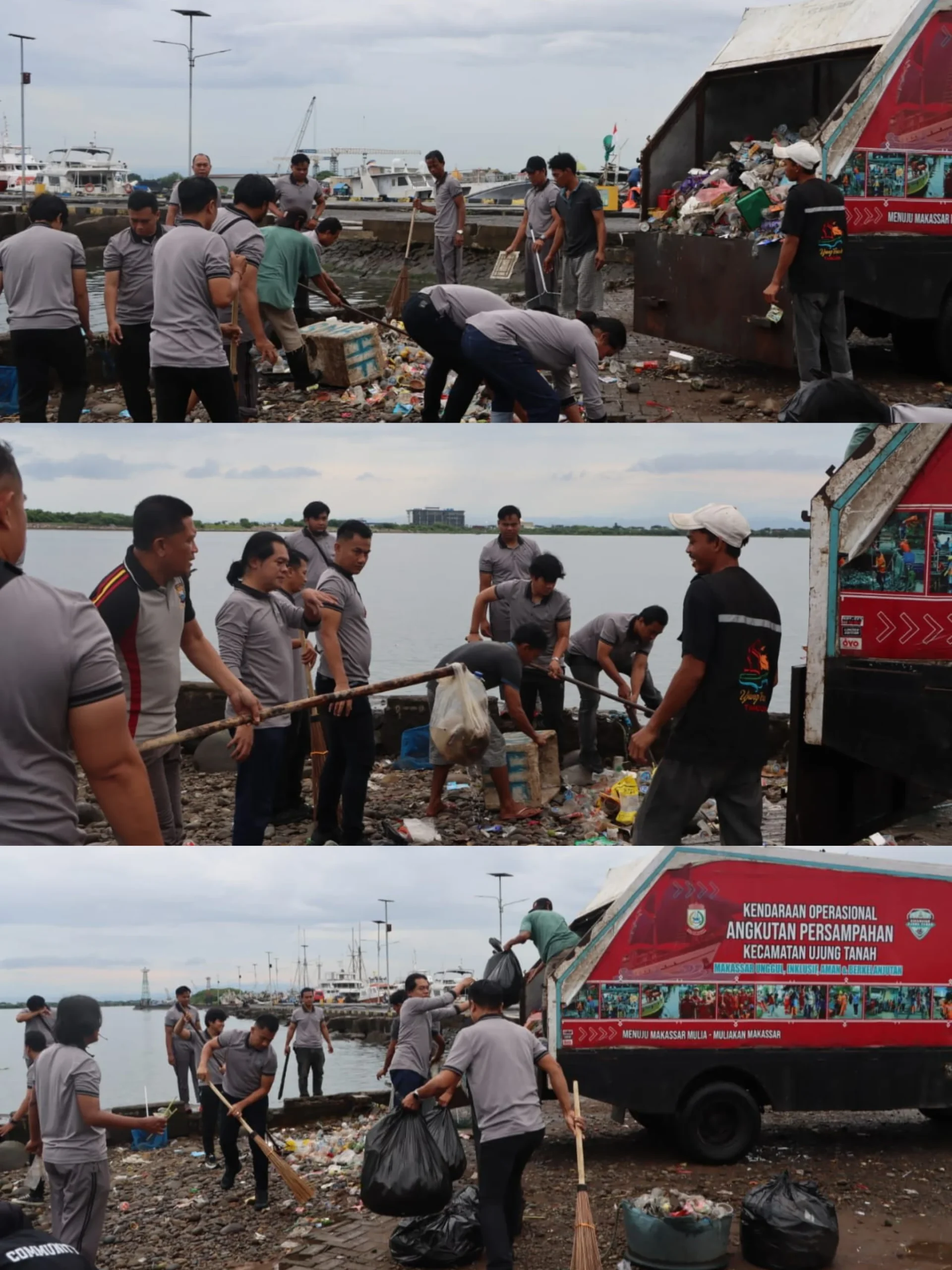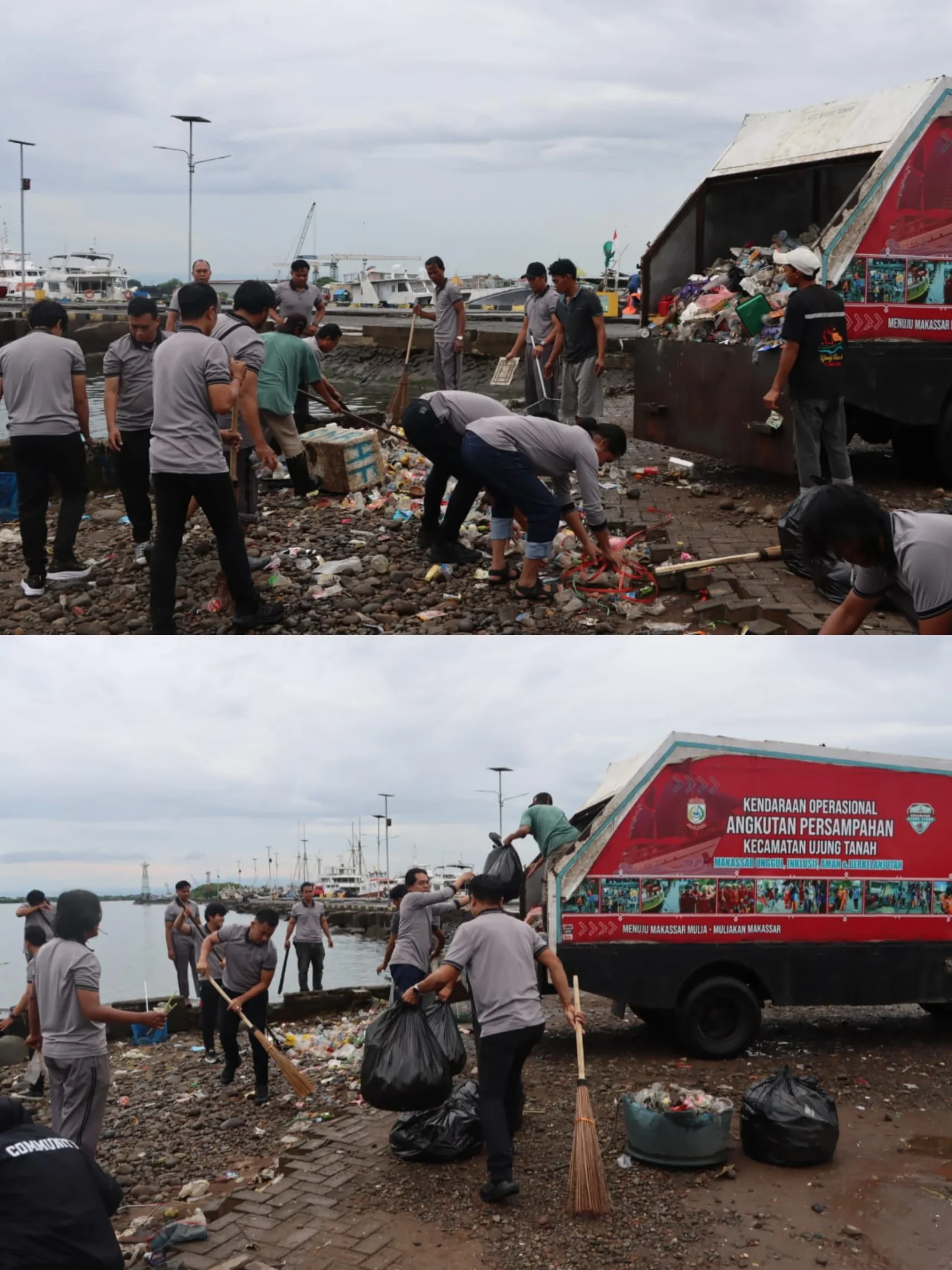 Sat Intelkam Polres Pelabuhan Makassar Gelar Bakti Sosial Bersihkan Sampah Plastik di Pelabuhan Paontere.