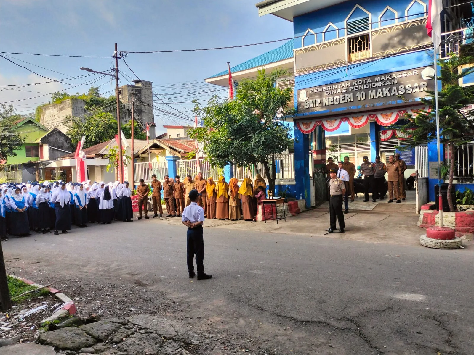 Upacara yang berlangsung khidmat di halaman sekolah tersebut diikuti oleh Kepala Sekolah, para guru, karyawan, serta seluruh siswa-siswi SMP Negeri 10. Turut hadir pula Panit Binmas Polsek Bontoala Ipda A. Sultan dan Bhabinkamtibmas Kelurahan Timongan Lompoa Aiptu Hamzah Tike.